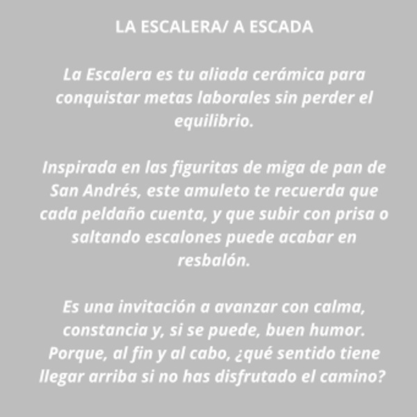 La Escalera es tu aliada cerámica para conquistar metas laborales sin perder el equilibrio. Inspirada en las figuritas de miga de pan de San Andrés, este amuleto te recuerda que cada peldaño cuenta, y que subir con prisa o saltando escalones puede acabar en resbalón. Es una invitación a avanzar con calma, constancia y, si se puede, buen humor. Porque, al fin y al cabo, ¿qué sentido tiene llegar arriba si no has disfrutado el camino?
