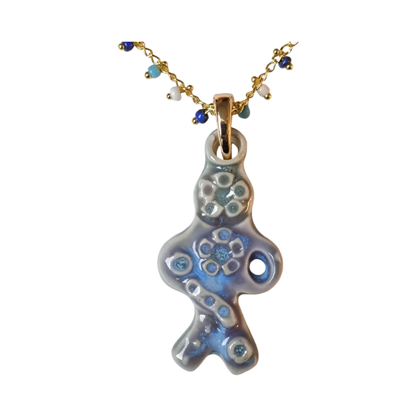 Se entrega en una gargantilla esamblada a mano con cadena de latón de alta calidad que incorpora delicados abalorios de vidrio o piedra natural. Con una longitud ajustable (40-45cm), la cadena ha sido seleccionada cuidadosamente para armonizar con el esmalte y los matices cromáticos de tu joya.